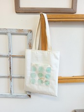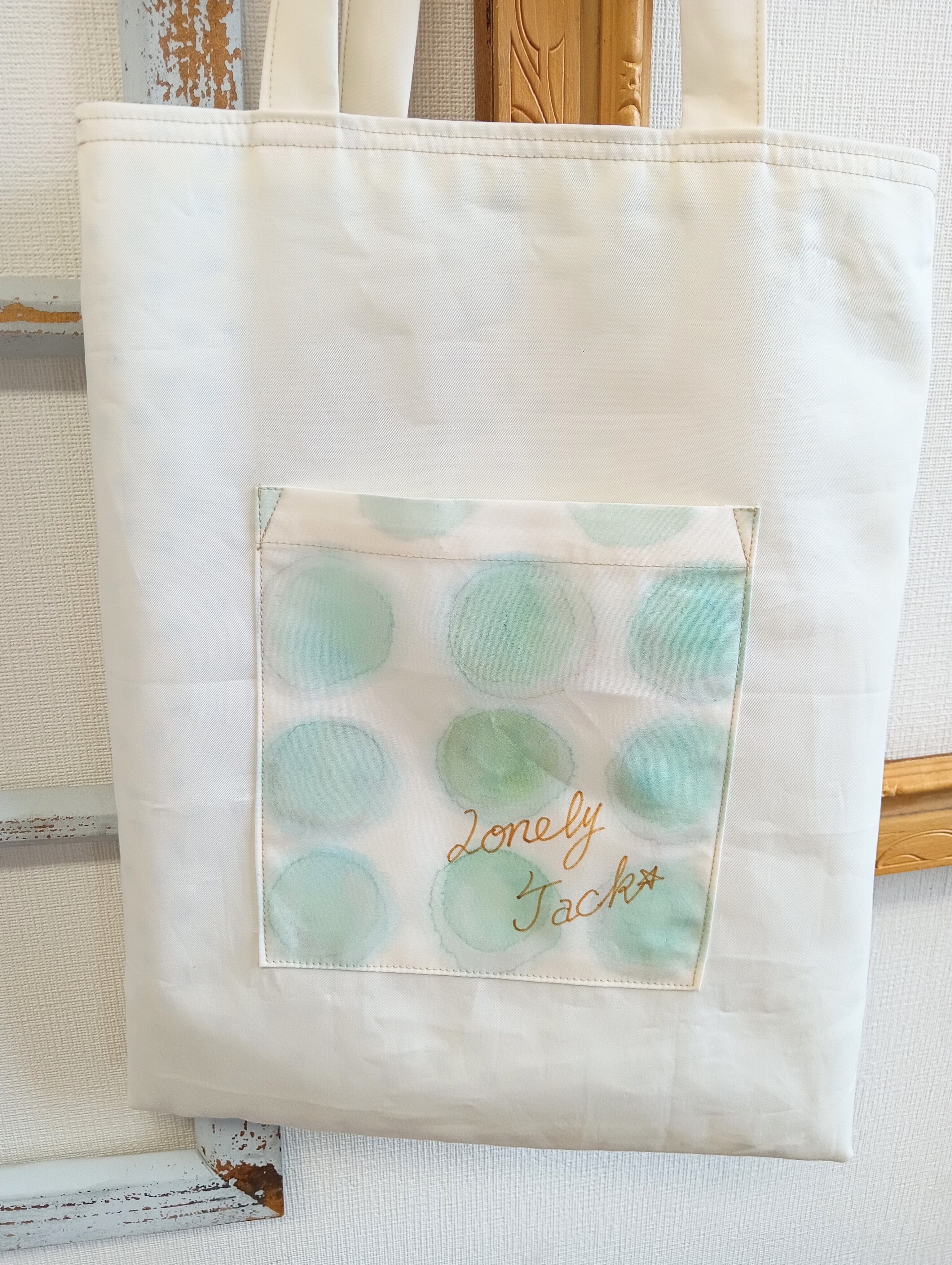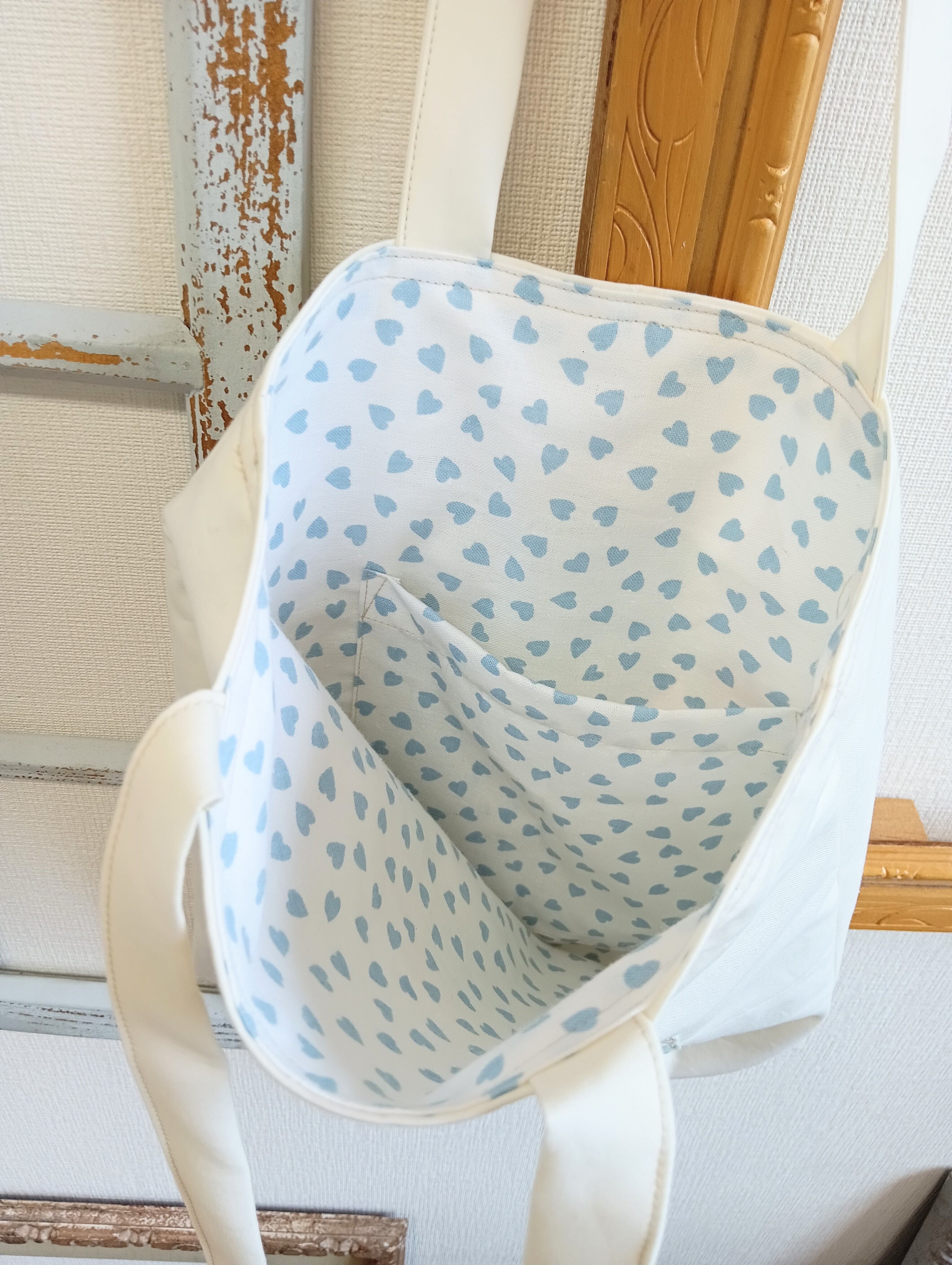 表はコットンのベージュ、裏は白に水色のハート柄で可愛いです。表地には芯を貼り、裏地もついて形もしっかりしていて物が入れやすいです。ポケットは表と裏に一つずつ、合計2つあるので便利に使えます。