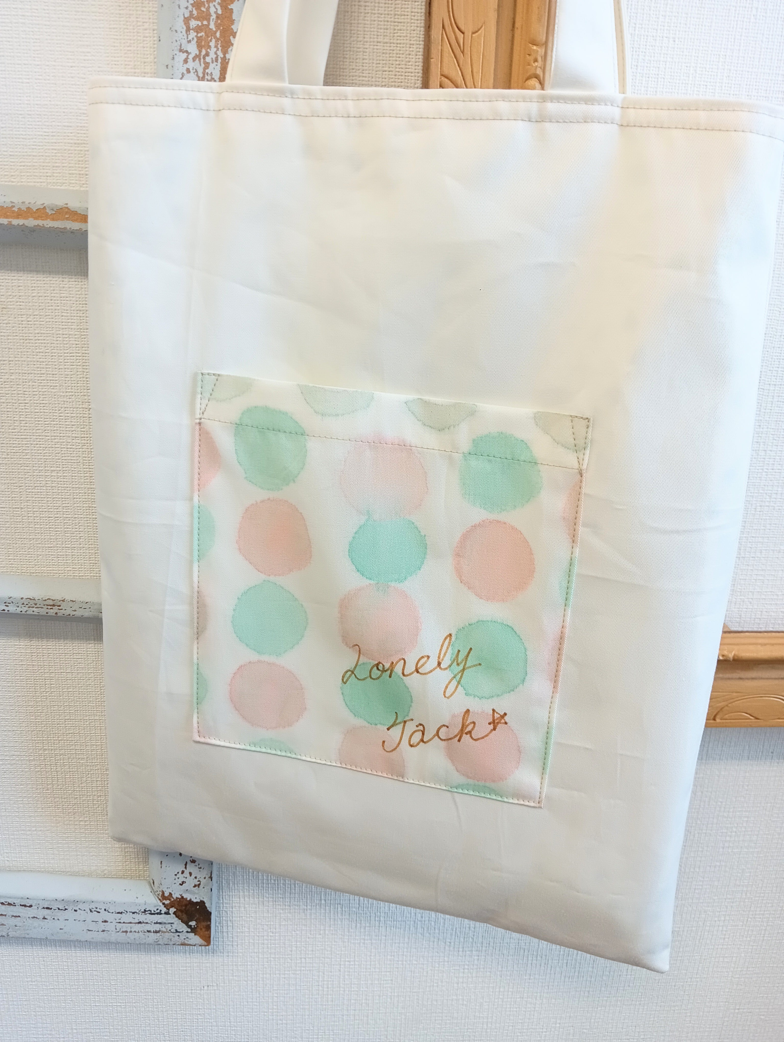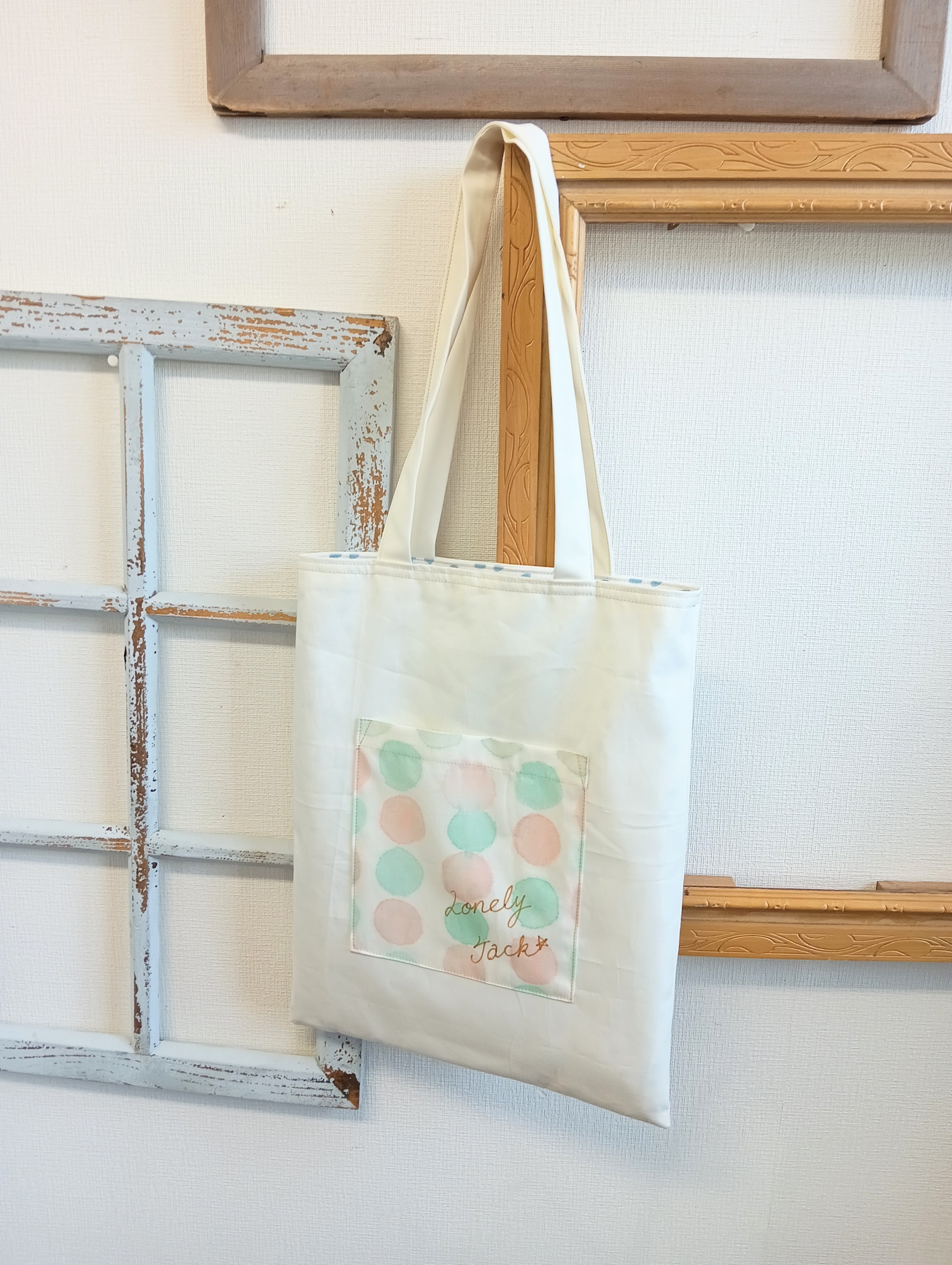 表はコットンのライトベージュ、裏は白に水色のハート柄で可愛いです。表地には芯を貼り、裏地もついて形もしっかりしていて物が入れやすいです。ポケットは表と裏に一つずつ、合計2つあるので便利に使えます。