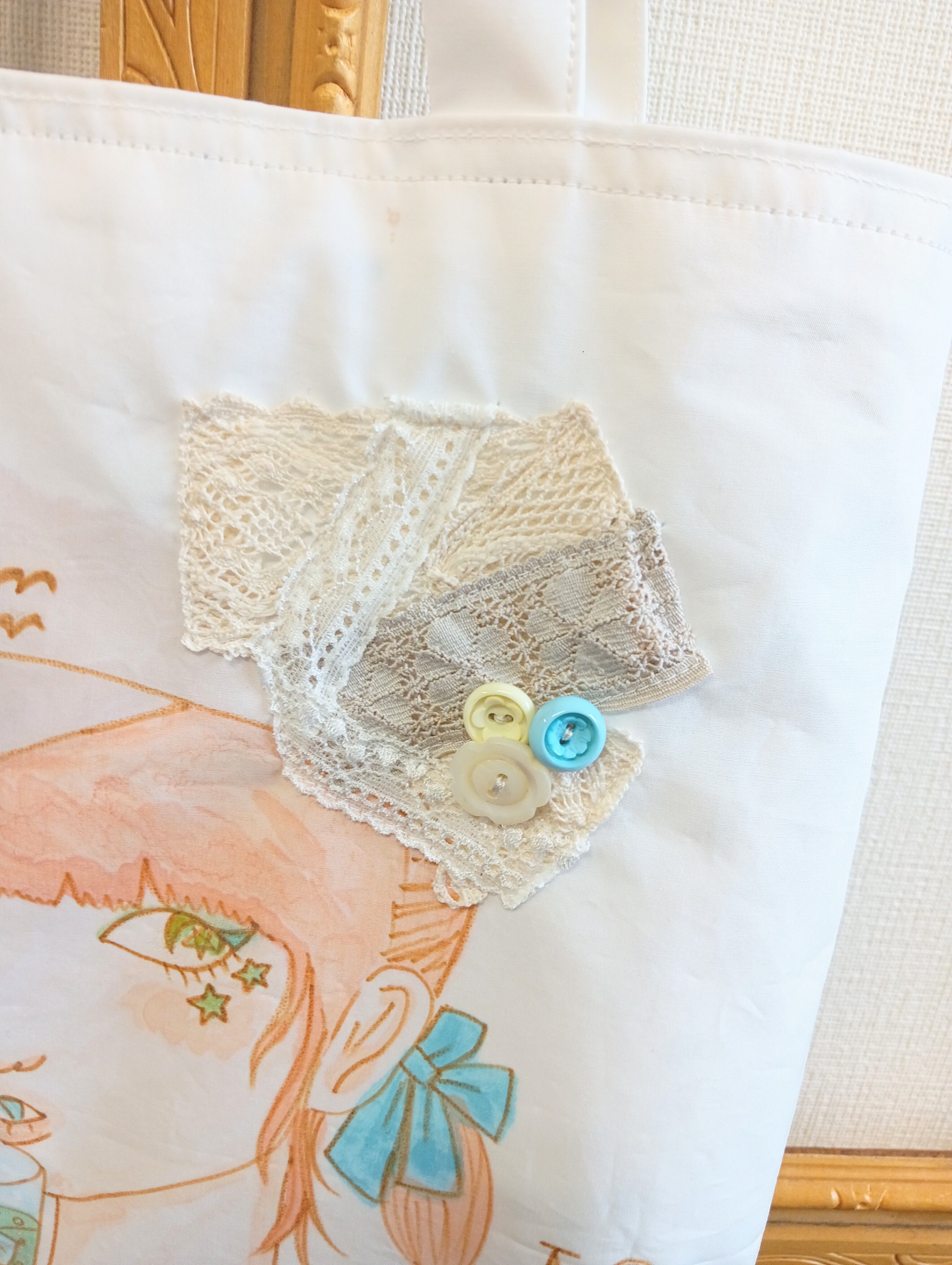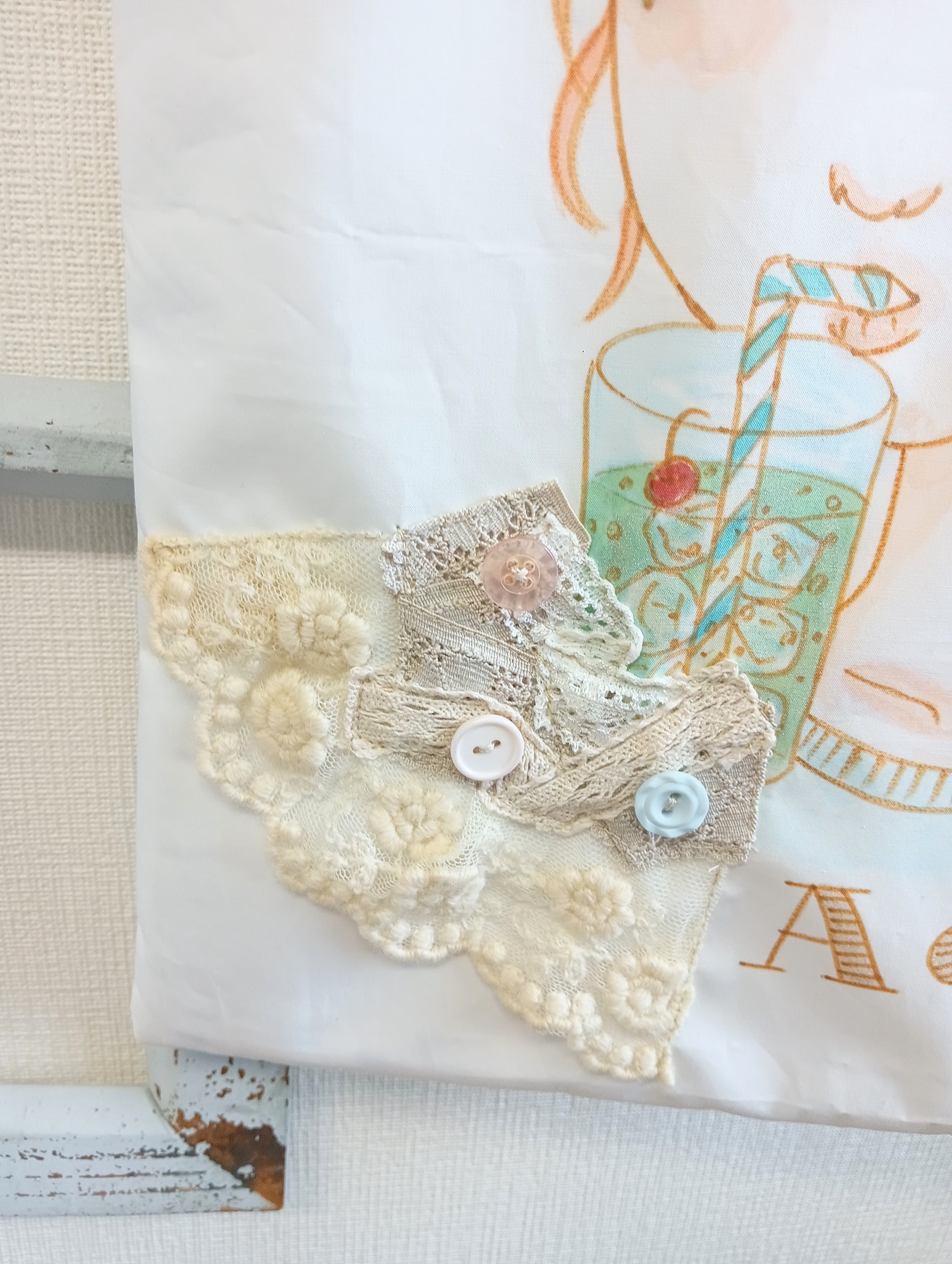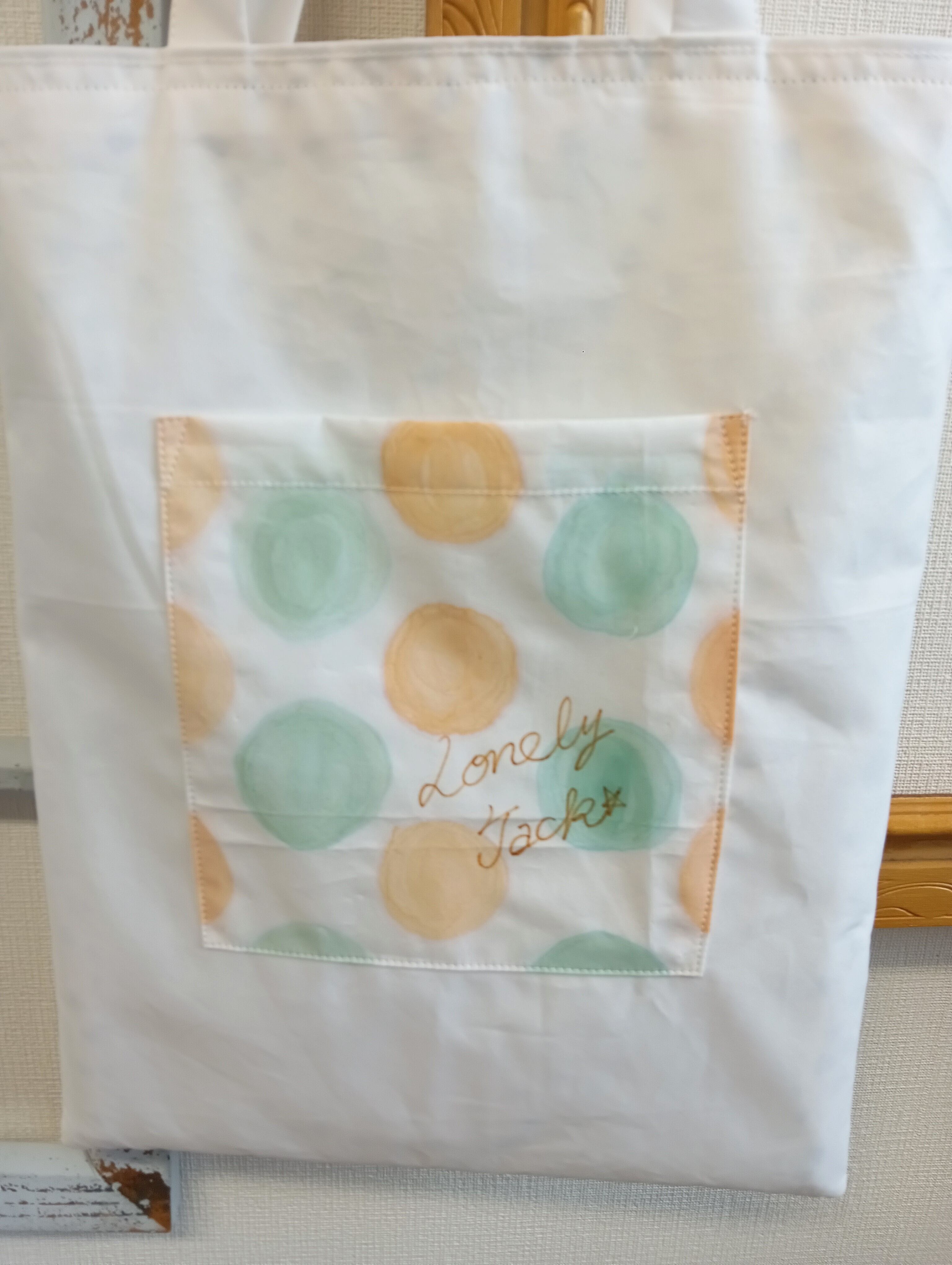 表はコットンのホワイト、裏は白に水色のハート柄で可愛いです。表地には芯を貼り、裏地もついて形もしっかりしていて物が入れやすいです。ポケットは表と裏に一つずつ、合計2つあるので便利に使えます。