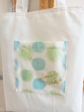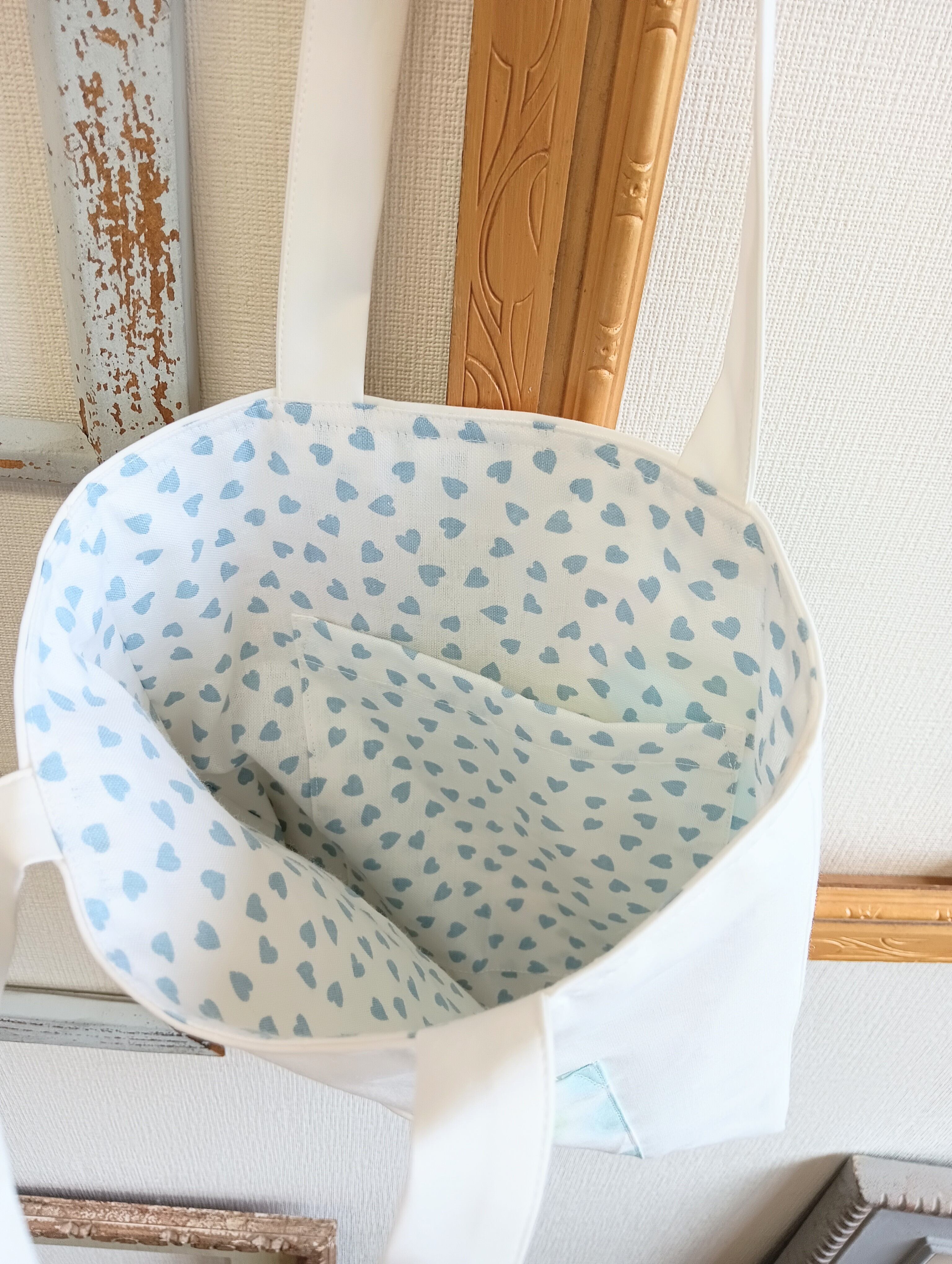 表はコットンのホワイト、裏は白に水色のハート柄で可愛いです。表地には芯を貼り、裏地もついて形もしっかりしていて物が入れやすいです。ポケットは表と裏に一つずつ、合計2つあるので便利に使えます。