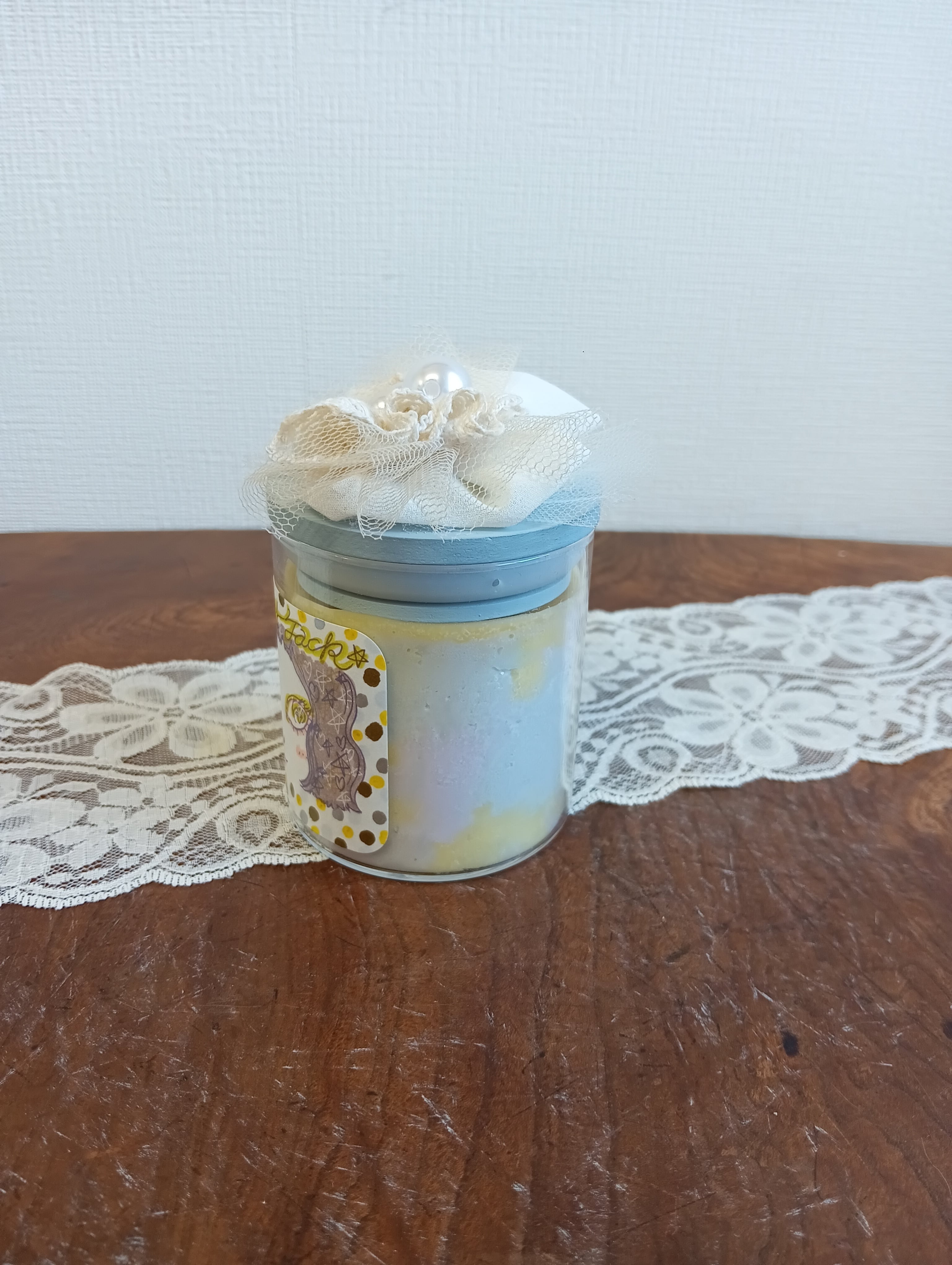 モカ色のヘアが可愛い女の子イラストのマーブル模様のキャンドル。キャンドルも3色(パープル、グレー、イエロー)のパステルな色合いでイラストのカラーとコーディネートしています。ロウはふわふわにホイップしてからカチッと固めました。模様は一点一点手作りで同じものは一つとありません。