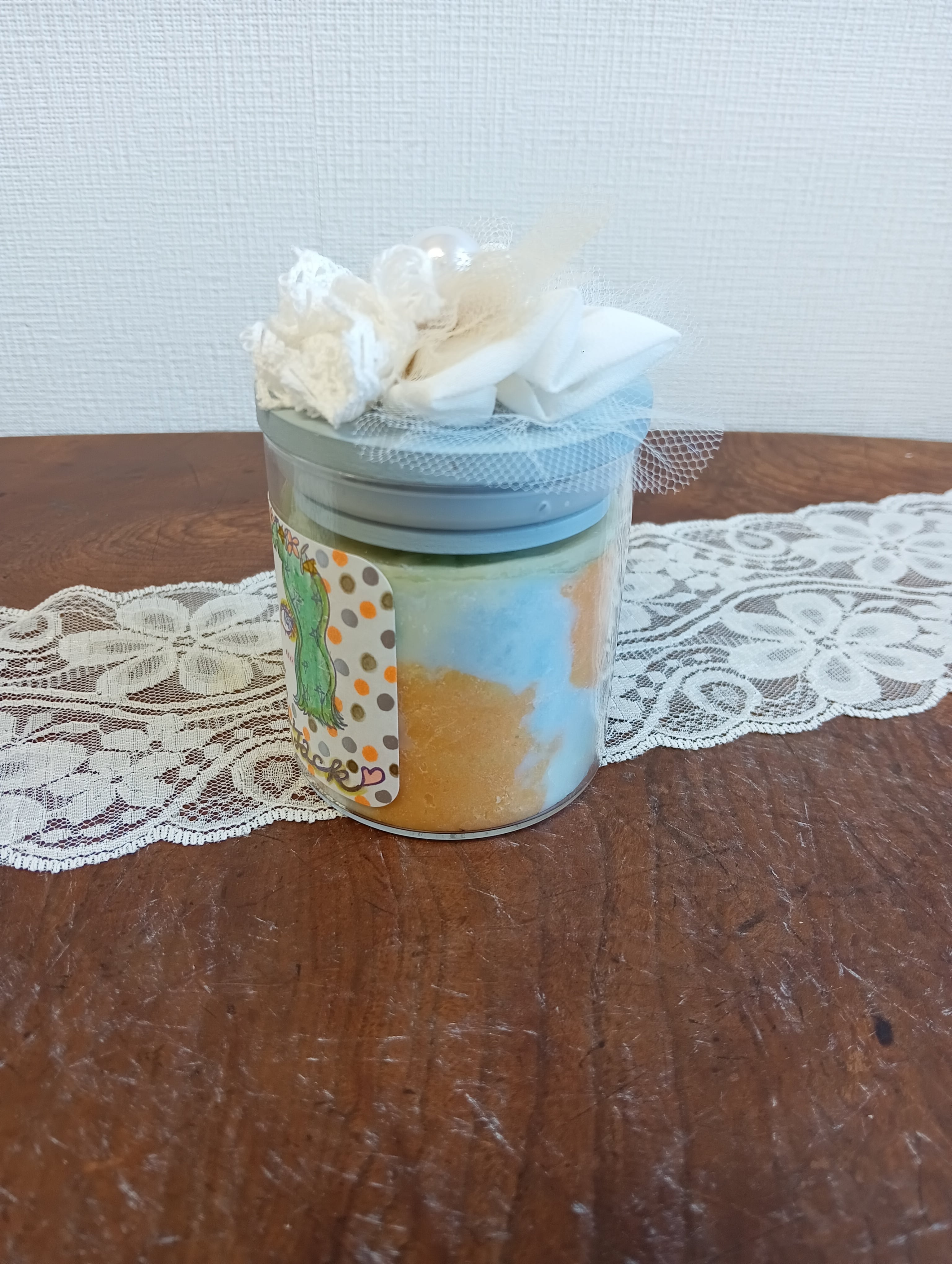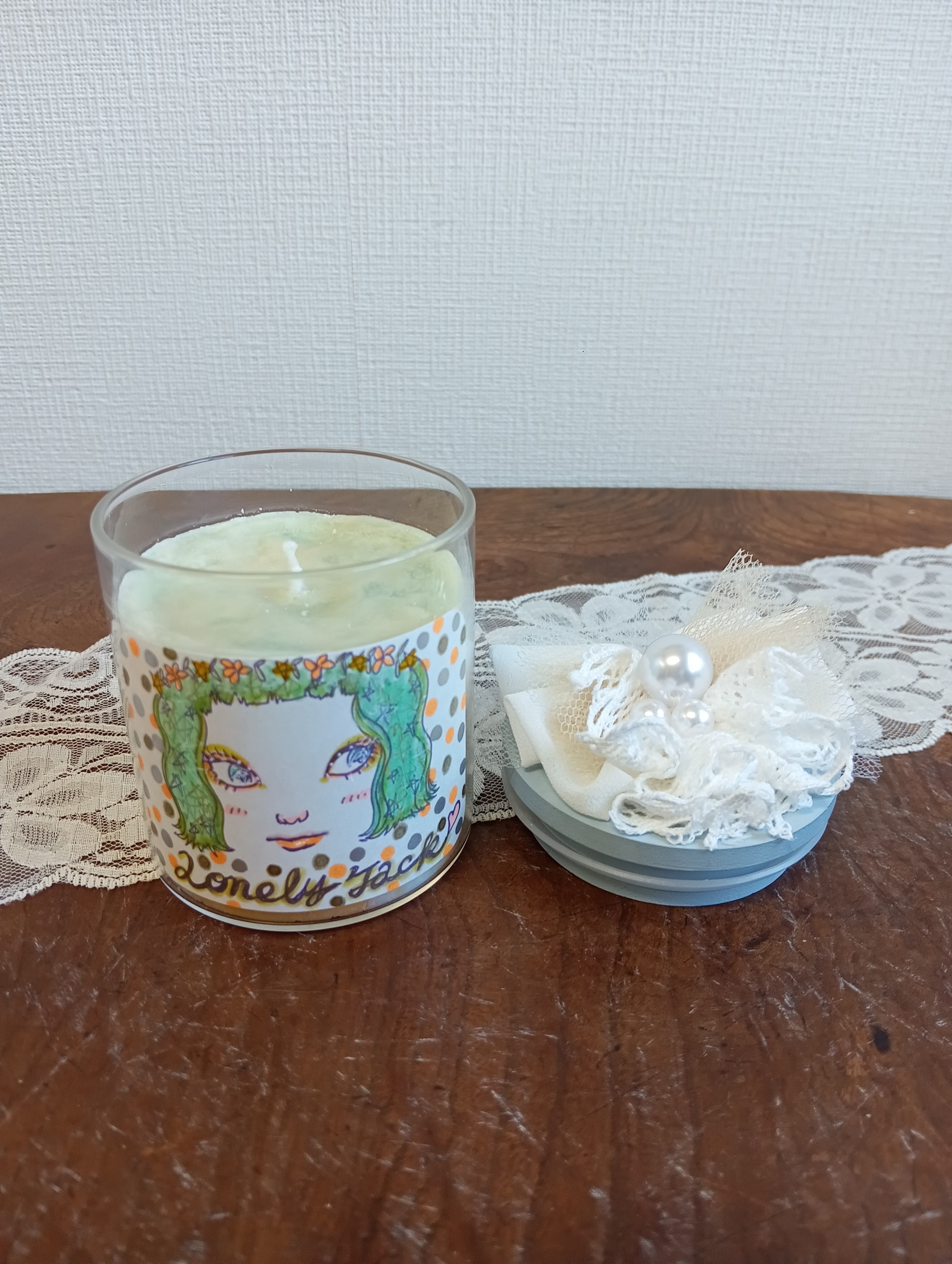 グリーンヘアの可愛い女の子イラストのマーブル模様のキャンドル。キャンドルも3色(グリーン、オレンジ、水色)のパステルな色合いでイラストのカラーとコーディネートしています。ロウはふわふわにホイップしてからカチッと固めました。模様は一点一点手作りで同じものは一つとありません。