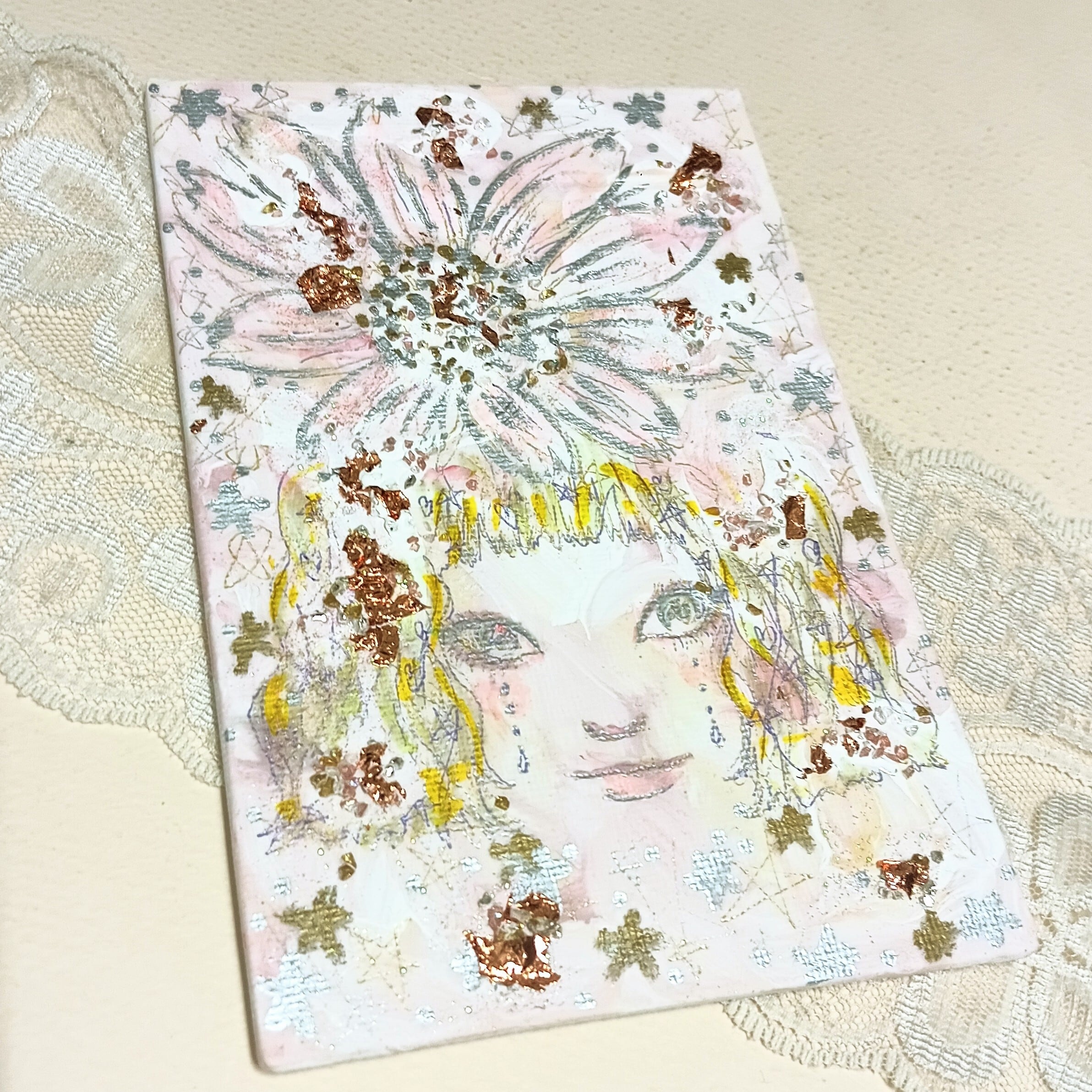 薄手のキャンパス地にアクリル絵の具とペンで絵描いてます。表面はイミテーションの金箔やガラスの金や銀や透明感ある小さなガラスの粒などを絵の具に乗せてテスクチャー感のあるデザインしています。