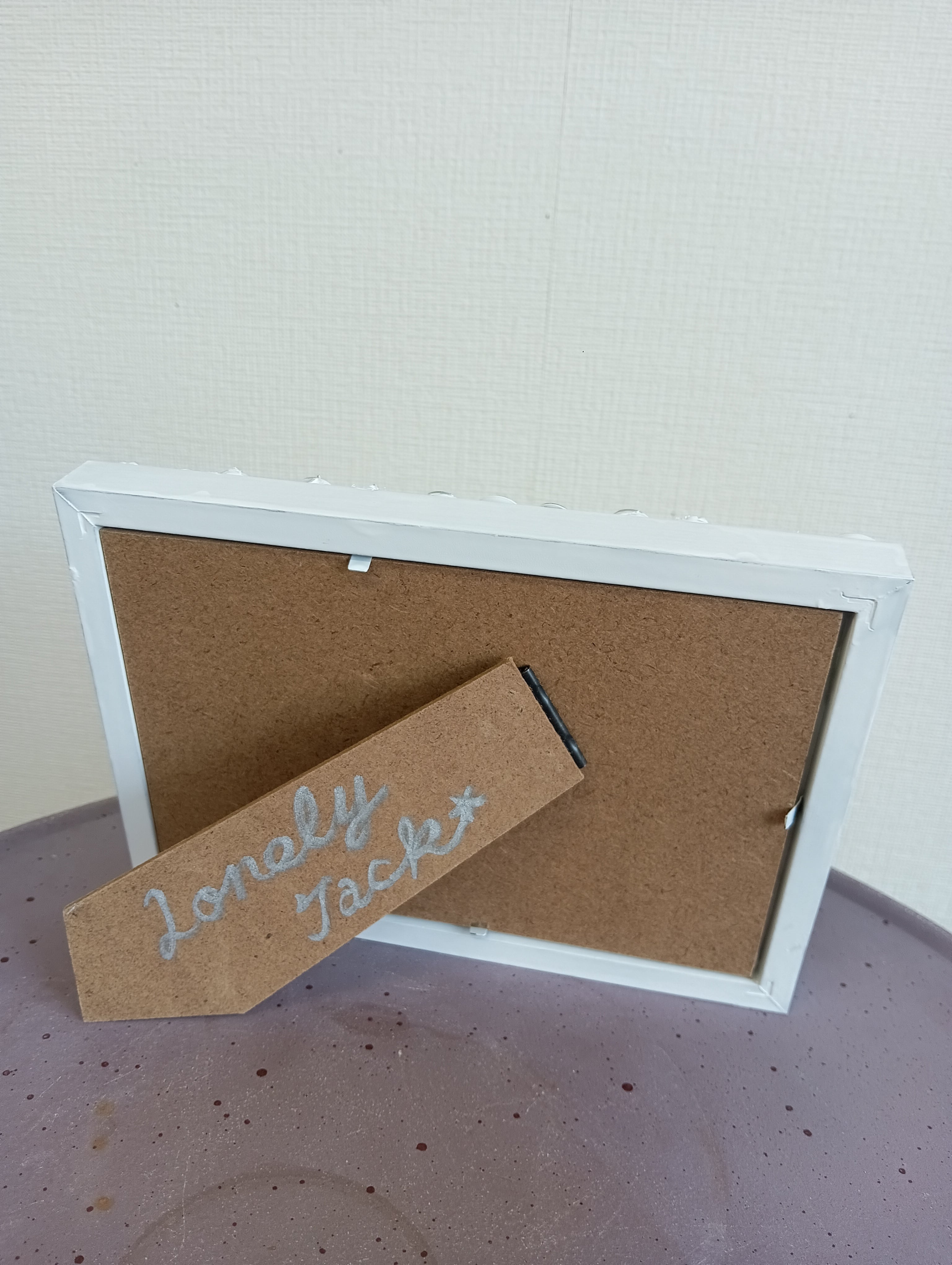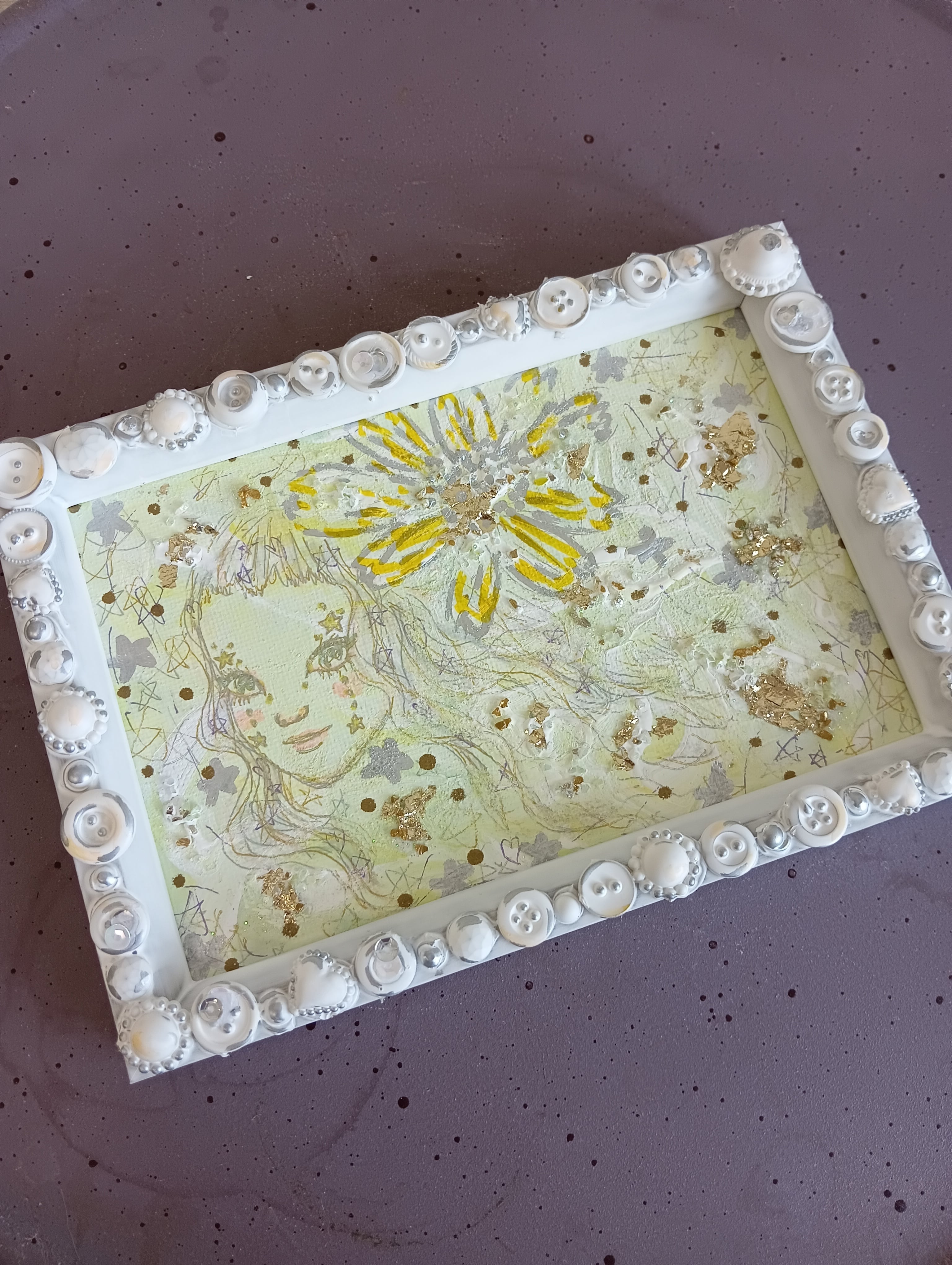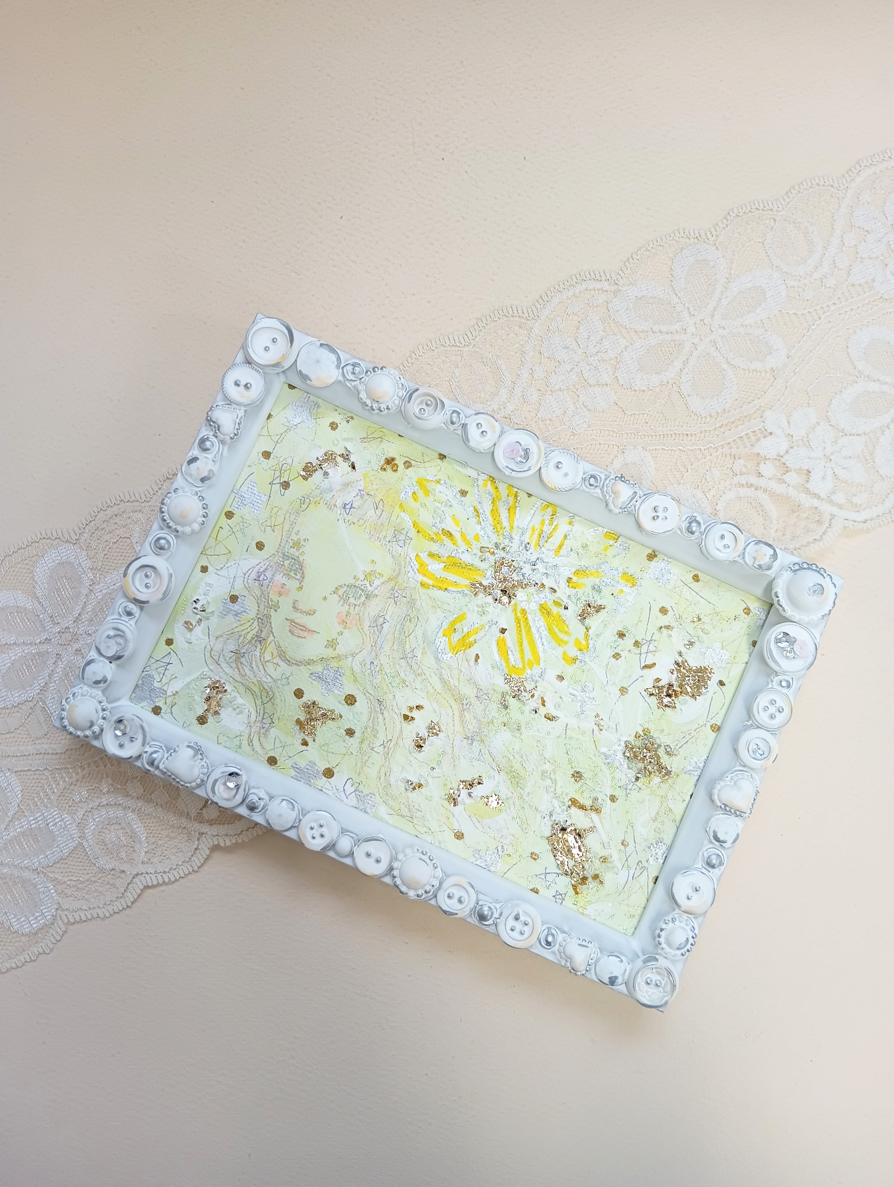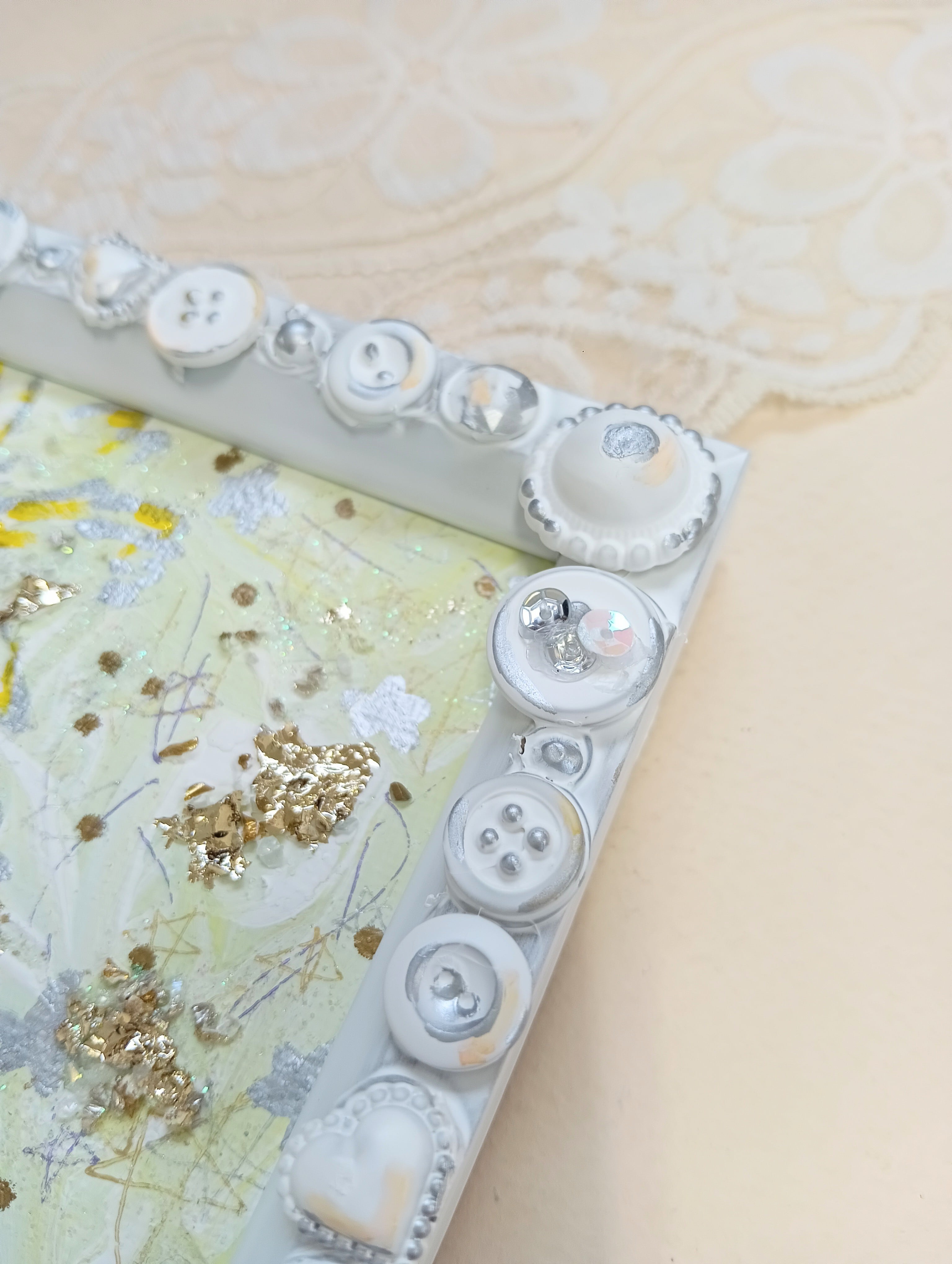 ボタンやラインストーン、パールなどをつけてあり上からマットホワイトの塗装、さらにスパンコールをほどこしてキラキラ可愛い!アート感溢れるデザインですが、色味を抑えてアンティーク風なので絵にマッチして使いやすいと思います。
