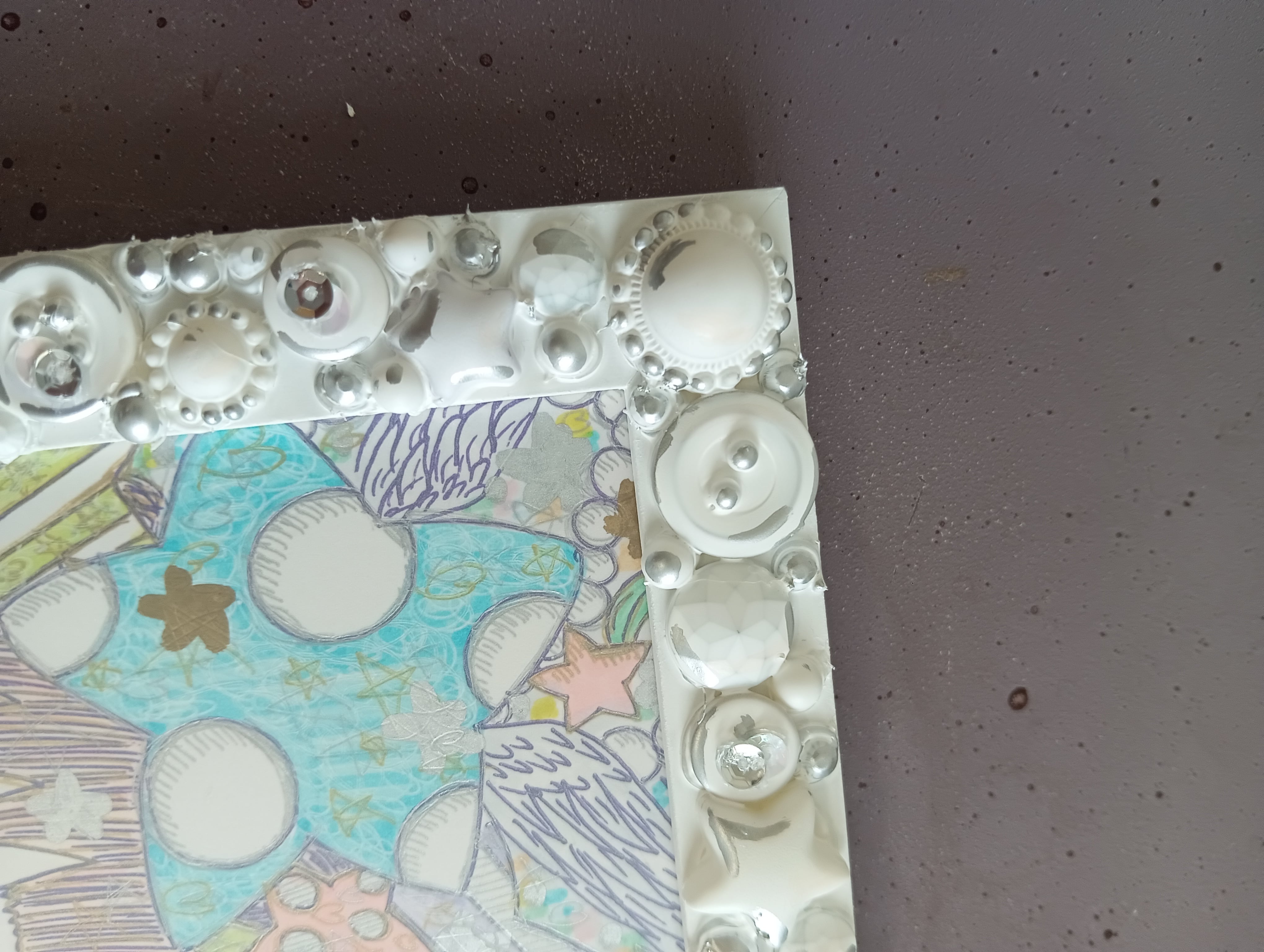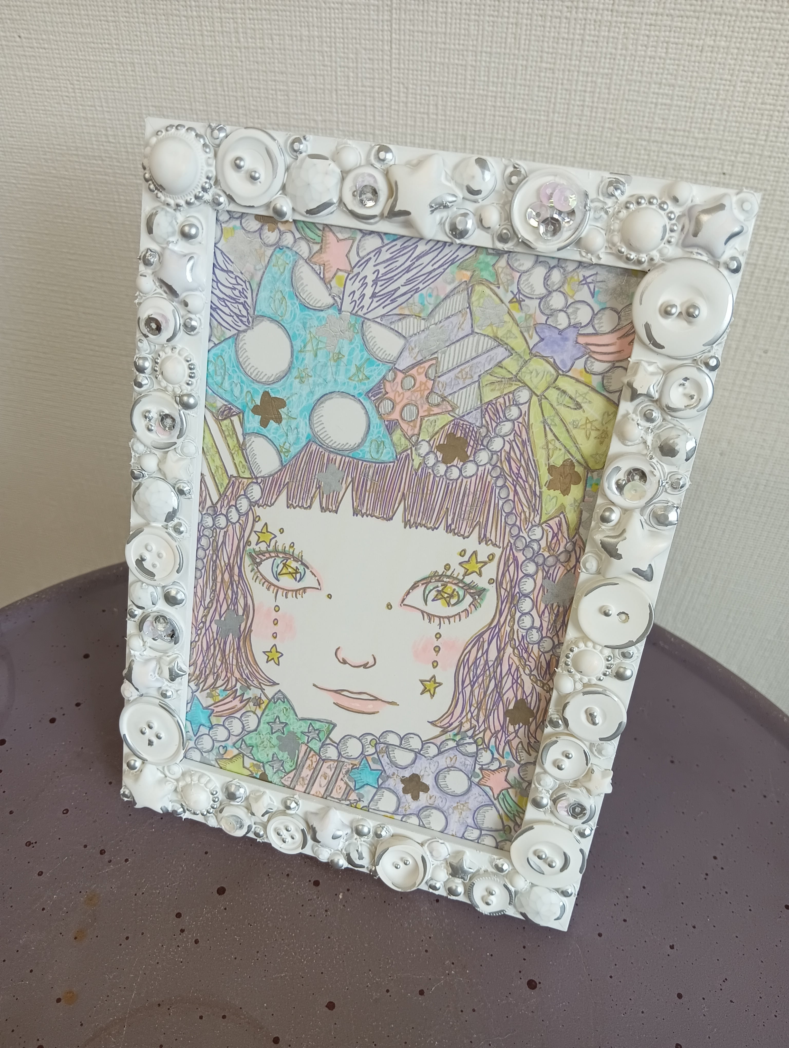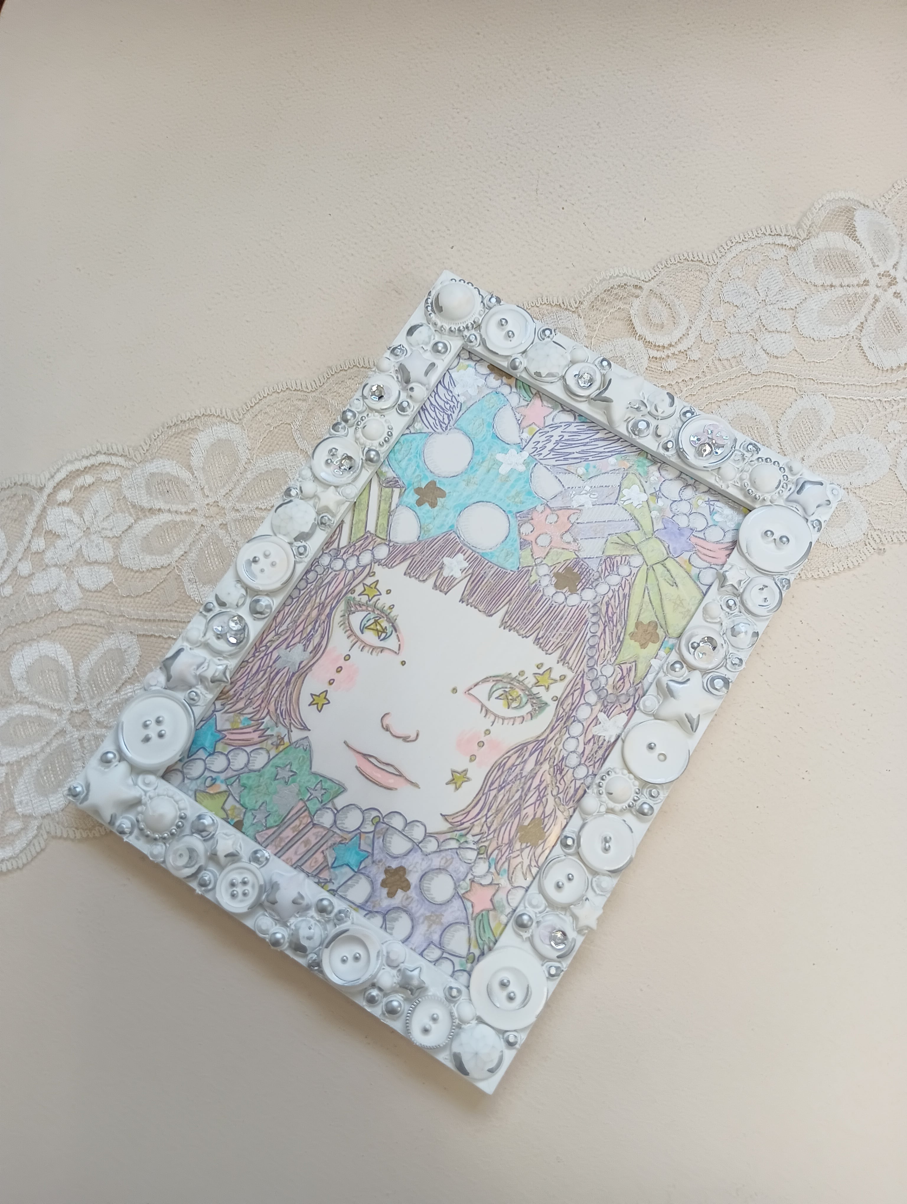 ボタンやラインストーン、パールなどをつけてあり上からマットホワイトの塗装、さらにスパンコールをほどこしてキラキラ可愛い!アート感溢れるデザインですが、色味を抑えてアンティーク風なので絵にマッチして使いやすいと思います。